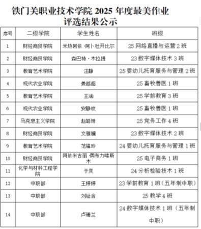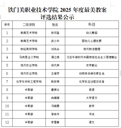为深耕教学内涵,弘扬优良学风,1月16日,铁门关职业技术学院开展2025年度最美教案、最美作业展评活动。本次评选面向全院师生征集优秀作品,共收到教案29份、学生作业35份参与评选。最终评选出最美教案12份,最美作业14份。