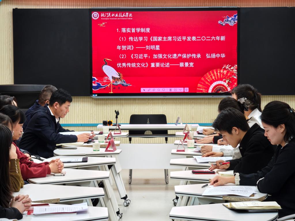 活动伊始,学院领导致欢迎词,强调本次活动是学院“党建+非遗”的创新实践,为师生搭建了非遗传承实践平台。随后,刘明星副局长传达学习习近平2026年新年贺词,学院相关负责人领学习近平总书记关于文化遗产保护的重要论述,筑牢思想根基。