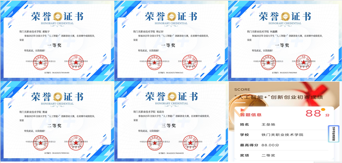 10月9日,铁门关职业技术学院学生在2025年全国大学生“人工智能+”创新创业大赛初赛中取得佳绩。信息智能工程学院组织28名学生参赛,在AI素养测试环节共获3项一等奖、2项二等奖、1项三等奖。