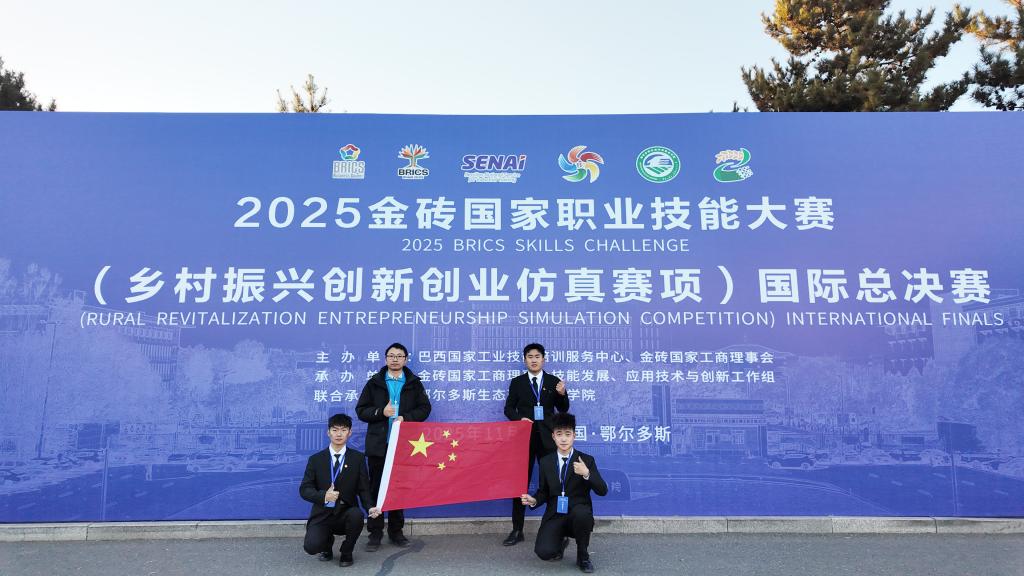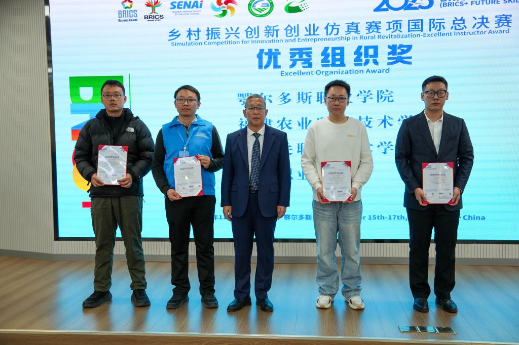 11月15日至17日,2025金砖国家职业技能大赛(乡村振兴创新创业仿真赛项)国际总决赛在鄂尔多斯生态环境职业学院举办。铁门关职业技术学院现代农业学院24级现代农业经济管理1班王浩、王存政、李天航三位同学组成的代表队表现卓越,凭借扎实的专业功底和出色的创新能力,荣获大赛铜奖。学院同时获得“优秀组织奖”,指导教师王宇雷、洪贤泰获“优秀指导专家”奖。