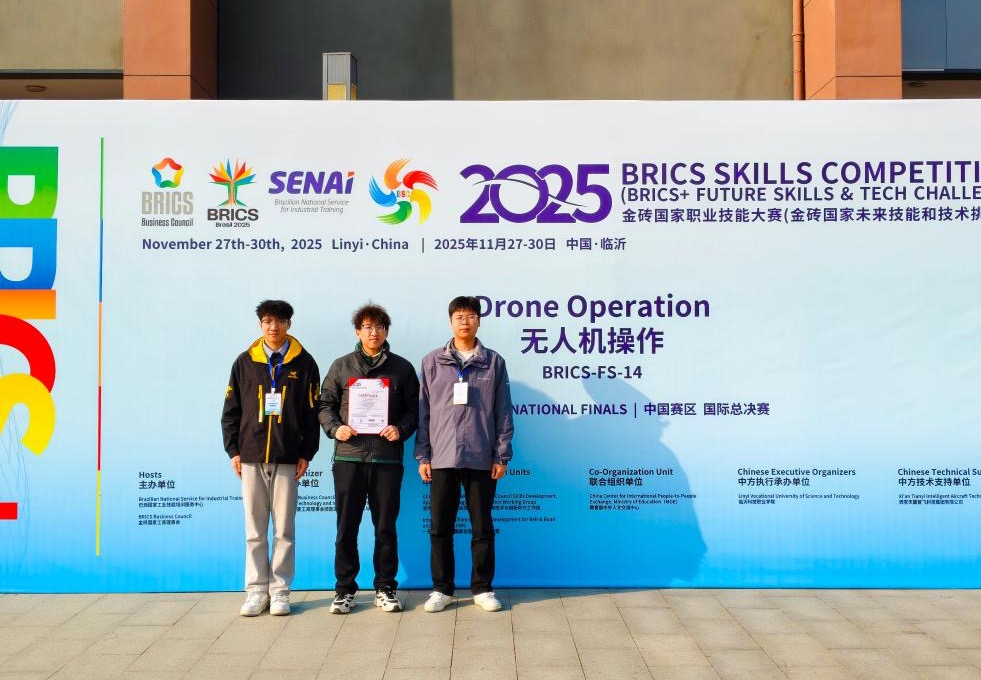 11月30日,金砖国家职业技能大赛无人机操作赛项国际总决赛在山东临沂科技职业学院闭幕。铁门关职业技术学院汽车与智能交通学院21级汽车检测五年制班黄维强、22级汽车检测五年制班龚浩冉组成的代表队,凭借精湛技艺,从86支顶尖队伍中脱颖而出,荣获大赛三等奖。