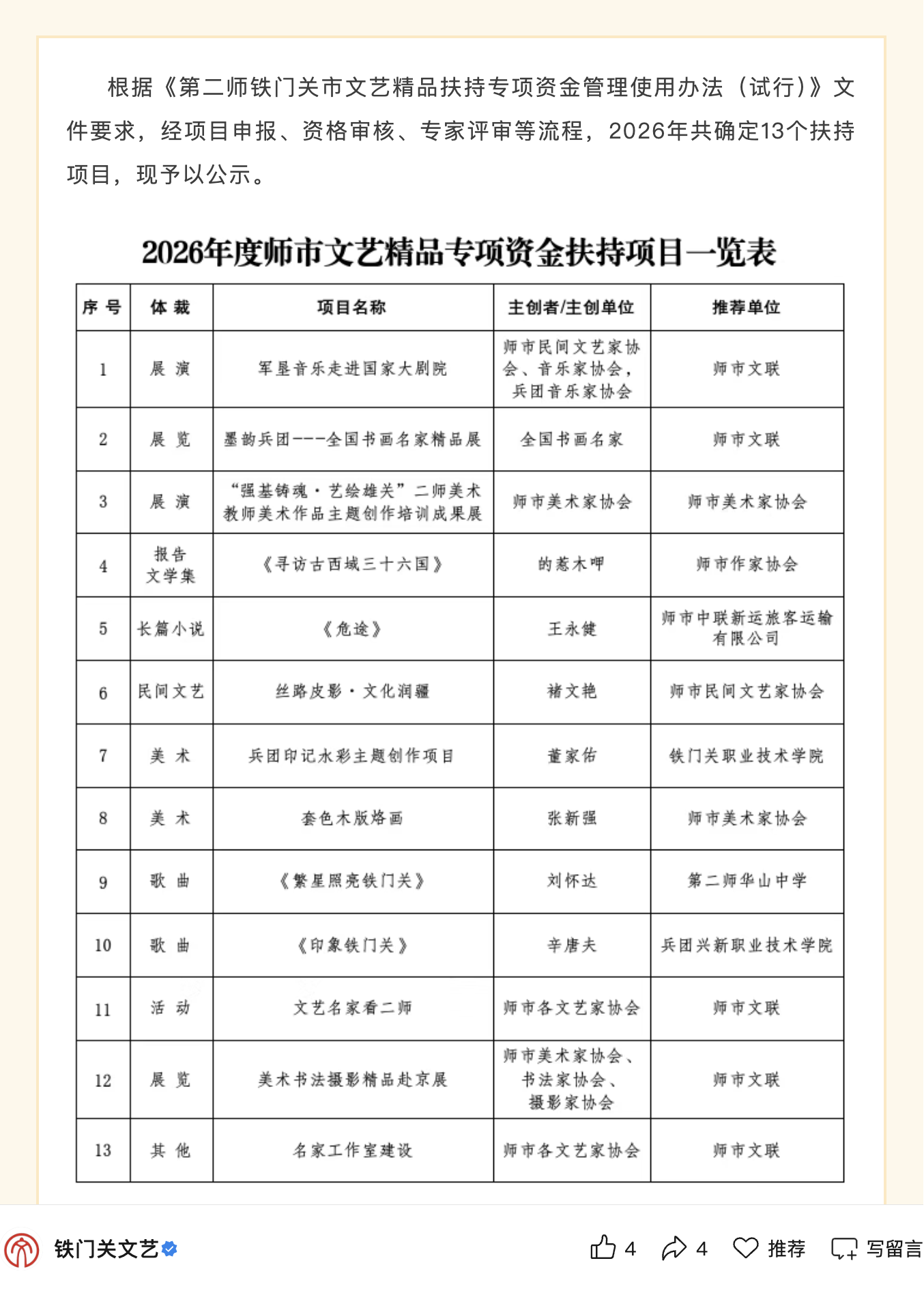 根据《第二师铁门关市文艺精品扶持专项资金管理使用办法(试行)》文件要求,经项目申报、资格审核、专家评审等多环节严格遴选,3月9日,2026年度师市文艺精品专项资金扶持项目名单正式公示。铁门关职业技术学院教育艺术学院教师董家佑个人申报的“兵团印记水彩主题创作项目”成功入选,成为本次13个扶持项目之一!