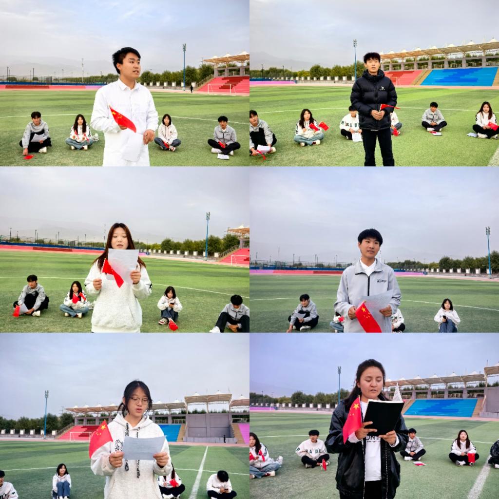秋日暖阳中,同学们在绿茵场上围坐成圆,象征红色基因环环相扣、革命精神生生不息。大家依次登台,深情诵读红色经典选段,并结合个人学习成长经历,分享感悟与思考。