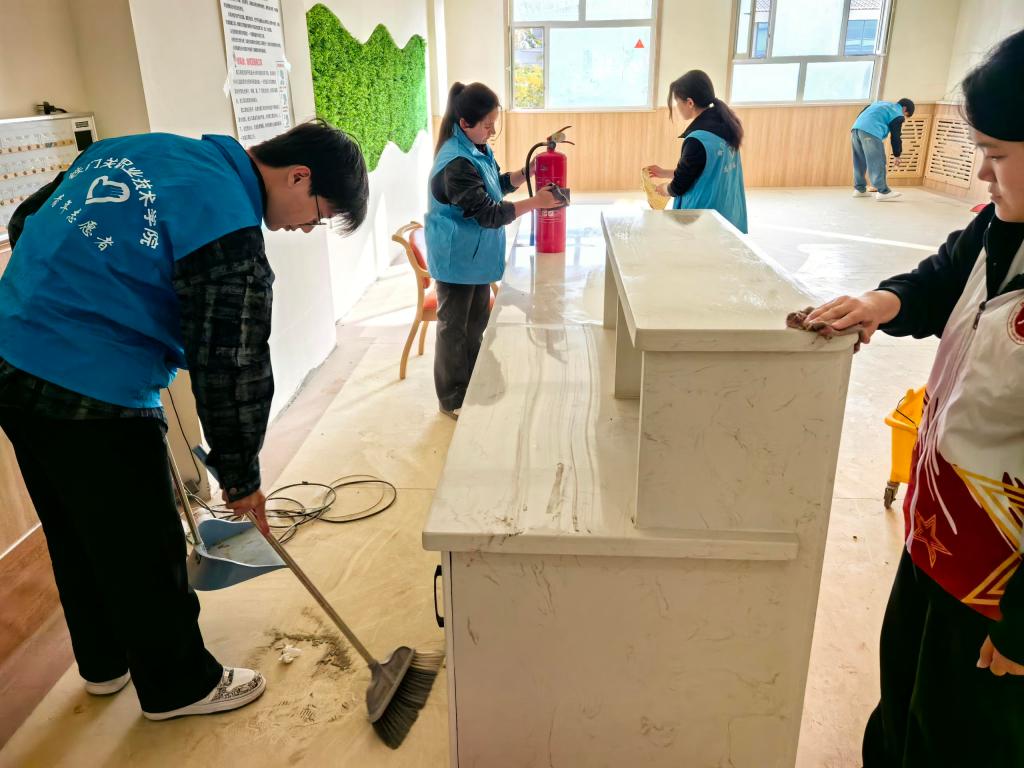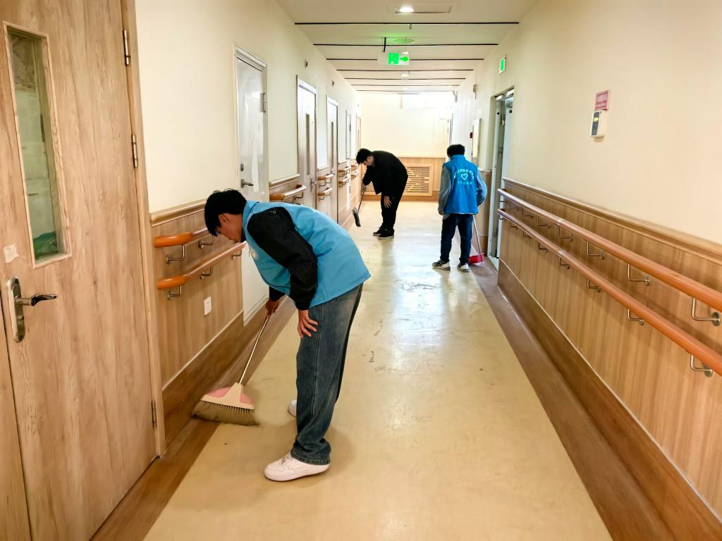 活动当天,志愿者们早早抵达养老院。在工作人员的安排下,大家迅速投入服务状态。同学们分工协作、默契配合,手持扫帚、抹布等清洁工具,认真细致地清扫走廊与楼梯,擦拭窗台、扶手及桌椅。