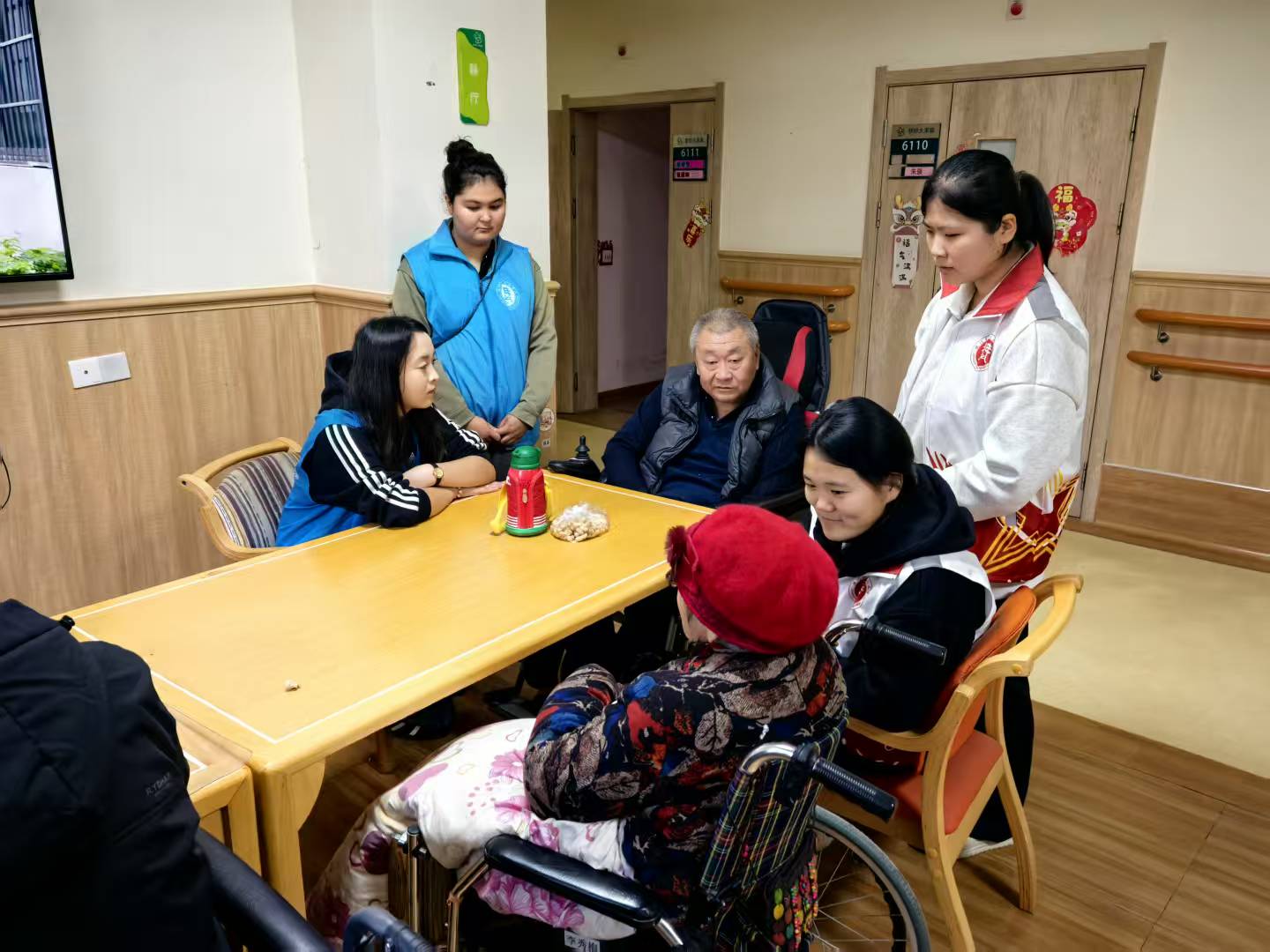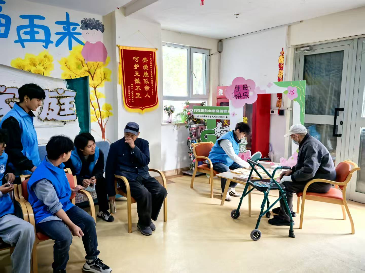 打扫工作结束后,温馨的互动环节拉开序幕。志愿者们分组走进老人们的房间和活动区,围坐在他们身边,亲切地与长辈们拉家常、聊生活。大家神情专注地倾听老人们讲述往昔岁月、兵团建设历程与人生感悟,在一段段真实的故事中,深刻感悟着艰苦奋斗、无私奉献的兵团精神。有的同学与老人对弈棋局,在方寸棋盘间交流智慧、共享乐趣;有的同学主动为老人揉肩捶背、整理床铺衣物;还有的同学搀扶老人散步,细心叮嘱他们注意季节变化、保重身体。