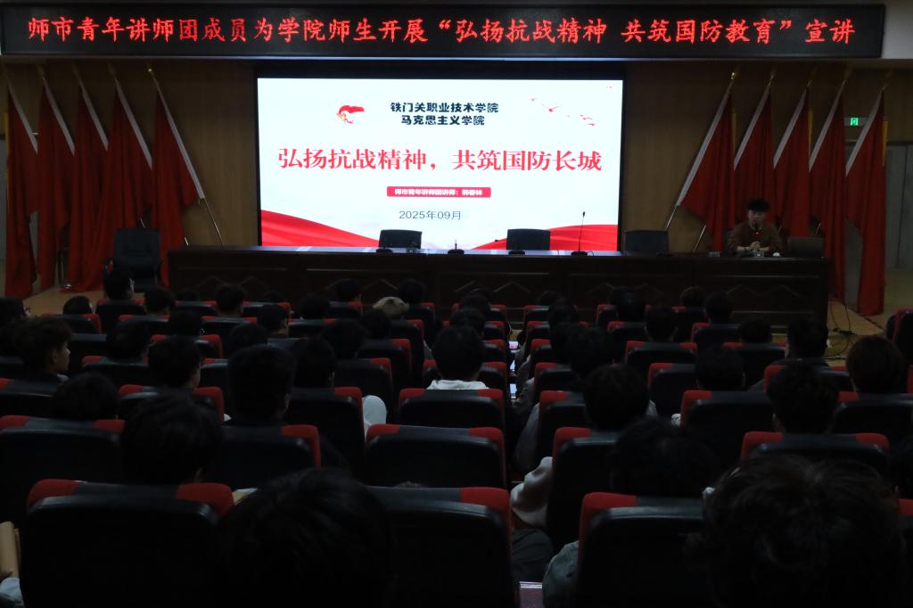 9月30日,铁门关职业技术学院马克思主义学院在燕赵楼121阶梯教室举办“弘扬抗战精神,共筑国防长城”专题宣讲会。师市青年讲师团成员。马克思主义学院教师韩春林担任主讲,学院500余名师生参加。