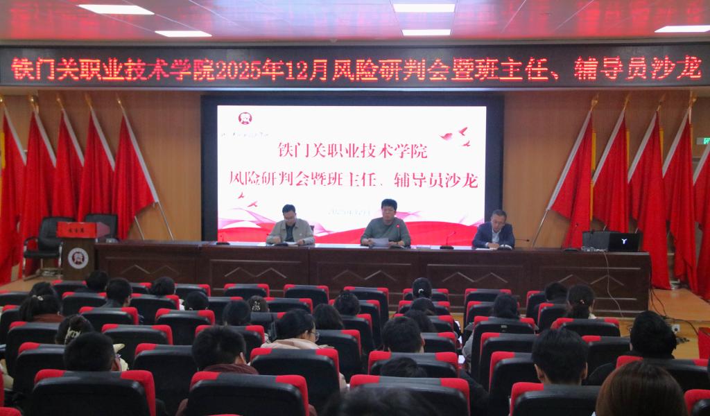 为进一步提升学生管理服务工作质量,强化班主任、辅导员队伍建设,12月24日,铁门关职业技术学院在燕赵楼121阶梯教室召开12月学生管理风险研判会暨班主任、辅导员沙龙活动。各二级学院分管学生工作的负责人、全体学工秘书、班主任及辅导员参会。
