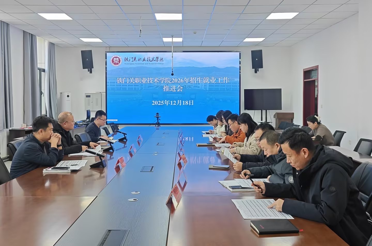 12月18日,铁门关职业技术学院招生就业处组织召开2026年专业计划招生工作推进会。学院主管招生就业工作的领导、教务处、招生就业处及各分院负责人参加此次会议,共同为新一年招生工作谋篇布局。