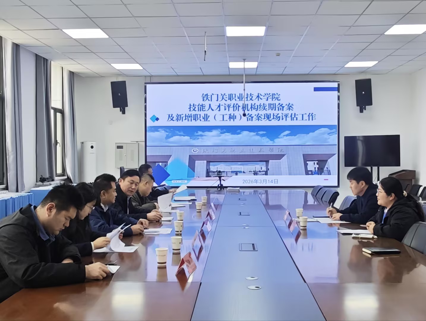 为加强对职业技能人才评价机构的监督管理,确保评价工作规范有序、结果公正有效,3月14日,第二师铁门关市人力资源和社会保障局公共就业和人才服务局副局长齐团结率评估工作组,赴铁门关职业技术学院,对学院社会培训评价机构开展有效期续期备案及新增职业(工种)备案现场评估工作。