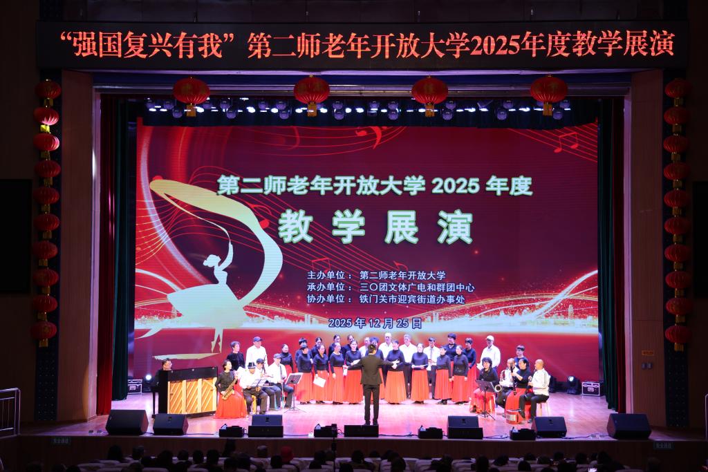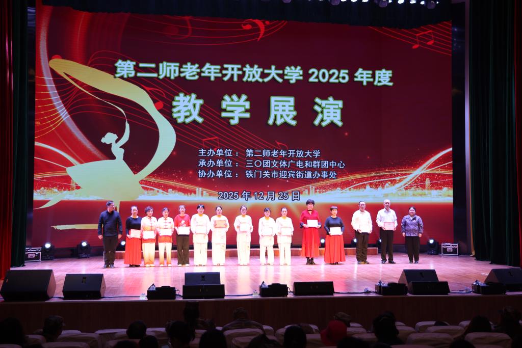 冬日暖阳映初心,银龄逐梦展风采。12月25日,第二师老年开放大学2025年度教学结业展演在第二师铁门关市三十团双丰镇职工文化活动中心举行。本次活动由第二师老年开放大学主办,三十团文体广电和群团中心承办,铁门关市迎宾街道办事处协办,集中展现了老年学员一年的学习成果与积极向上的精神风貌。