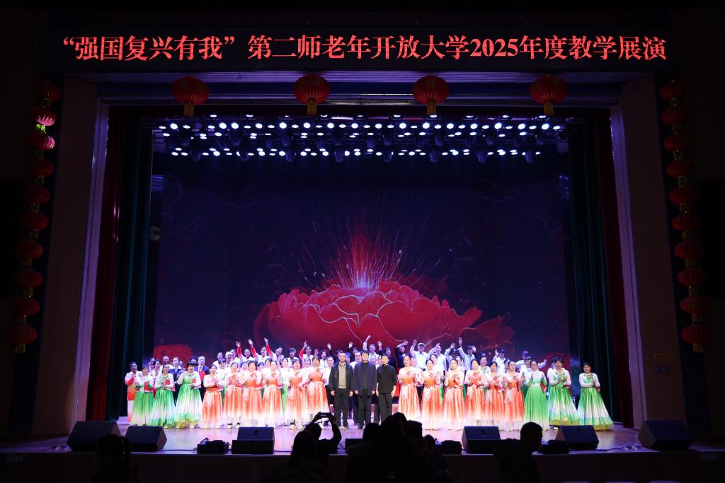 展演伊始,学院领导对老年开放大学2025年度教学工作给予充分肯定,向辛勤耕耘的教师和班主任致以诚挚谢意,并向顺利结业的学员们表示热烈祝贺,勉励全体老年学员永葆学习热情,在终生学习中收获更多快乐与成长。