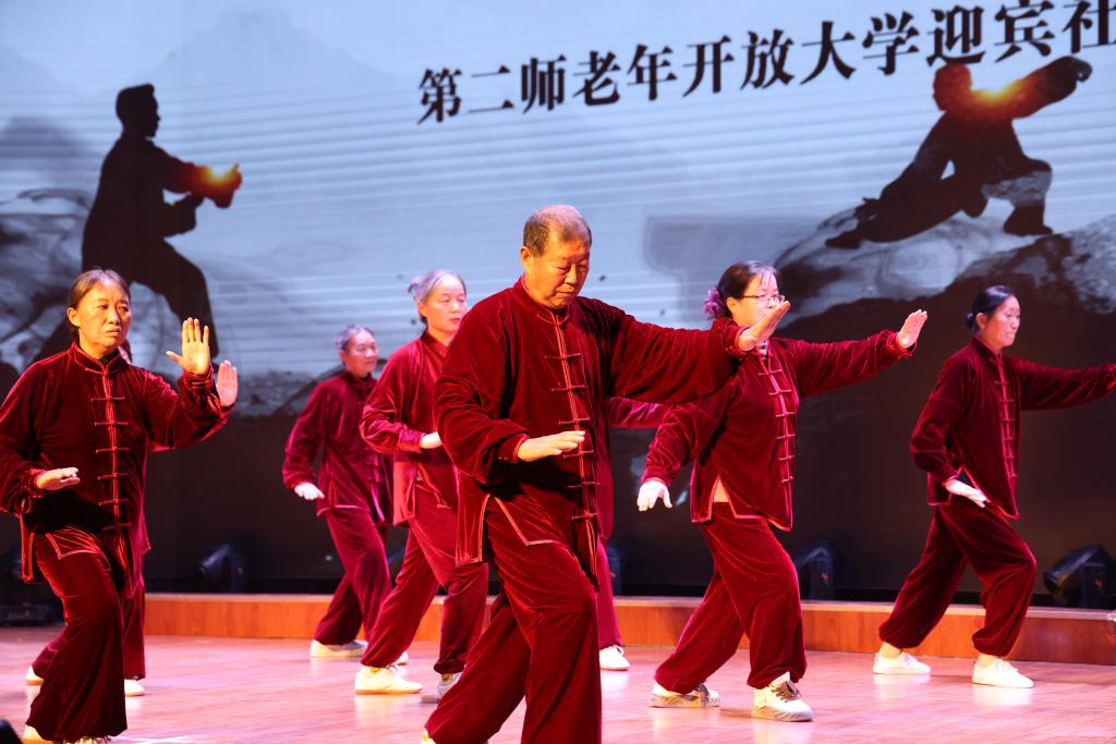 随后,精彩纷呈的节目轮番上演。来自第二师铁门关市三十团和铁门关市迎宾社区分校的学员们带来了形式多样、内容丰富的表演。20人演绎的健身操《健康摇摆》活力满满,节奏明快,展现了老年人积极向上的生活态度;12人组成的太极拳队伍一招一式刚柔并济,24式太极拳尽显中华传统武术的神韵与魅力;舞蹈《翻身农奴把歌唱》以优美的舞姿诉说着岁月的变迁,16名舞者用饱满的情感打动了现场观众;30人同台表演的健身气功《八段锦》动作整齐划一,尽显养生智慧。