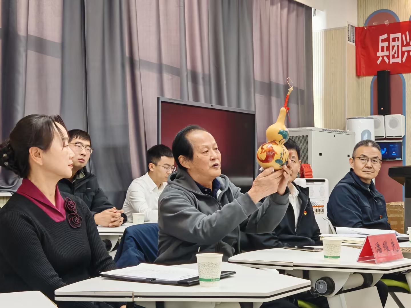 为推动中华优秀传统文化传承与党建工作深度融合,1月9日,铁门关职业技术学院教育艺术学院党支部联合第二师铁门关市文化体育广电和旅游局党支部在精技楼307智慧教室举办“匠心传承守初心・非遗文化润校园”主题党日活动。第二师铁门关市文化体育广电和旅游局副局长刘明星,第二师三〇团双丰葫芦烙画传承人潘耀先与第二师铁门关市文化体育广电和旅游局党支部全体党员、教育艺术学院党支部全体党员教师及师生代表参加活动。