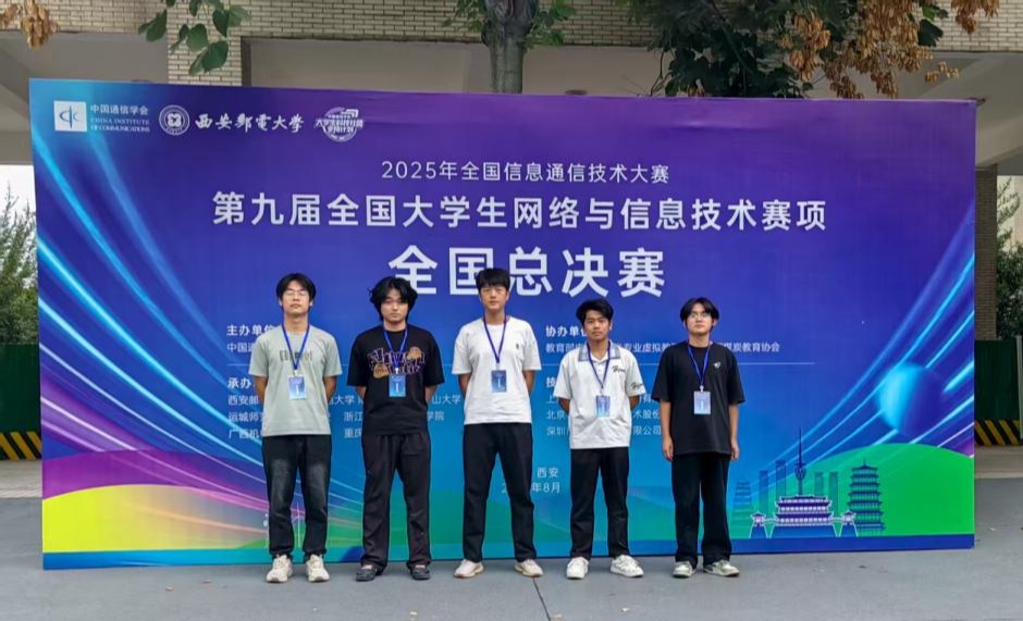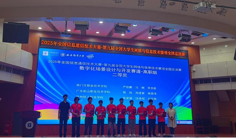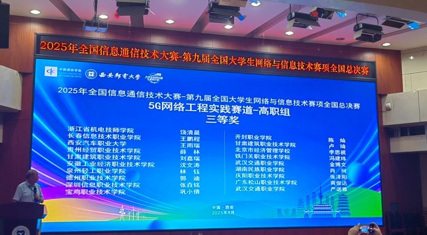 8月21日至23日,2025年全国信息通信技术大赛——第九届全国大学生网络与信息技术赛项全国总决赛在西安邮电大学顺利举行。铁门关职业技术学院信息智能工程学院学生在此次全国总决赛中表现优异,凭借扎实的专业知识和出色的实践能力,获得1项二等奖、2项三等奖。
