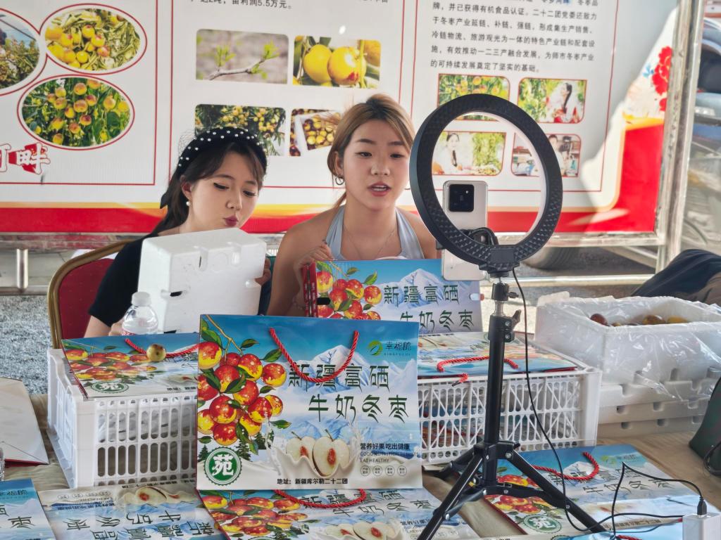 活动期间,学院选派师生加入产品展销组,运用电商直播、网络推广等模式,助力师市名优特农产品拓宽市场。在22团第三届冬枣文化旅游活动暨 “中国农民丰收节” 庆祝活动现场,师生团队聚焦富硒牛奶冬枣等特色农产品,借助专业直播设备与技术,实现农产品 “从田间到云端” 的直观呈现。