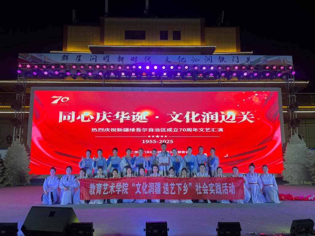 为庆祝新疆维吾尔自治区成立70周年,9月19日,第二师铁门关经济技术开发区管委会主办的“同心庆华诞·文化润边关”文艺汇演在铁门关市丝路香街举行。铁门关职业技术学院教育艺术学院师生艺术团凭借参演节目《寻礼》大放异彩,荣获“心弦拨动奖”。