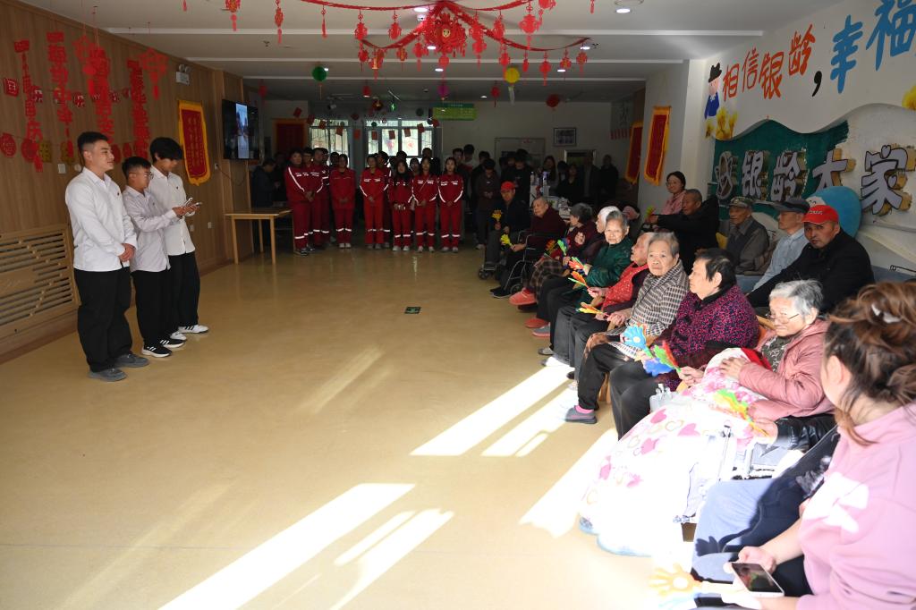文艺表演首先登场的24级汽车智能技术2班的李正垚同学带来了单人自编花球啦啦操表演,瞬间点燃了现场气氛,赢得了在场观众的阵阵掌声,让老年朋友们感受到了青春活力与积极向上的精神风貌。紧接着,24级汽车营销1班康宇强和24级汽车营销2班程志聪、李卓奥三位同学献上合唱《少年壮志不言愁》,唤起了大家的时代记忆,引发了现场观众的强烈共鸣。