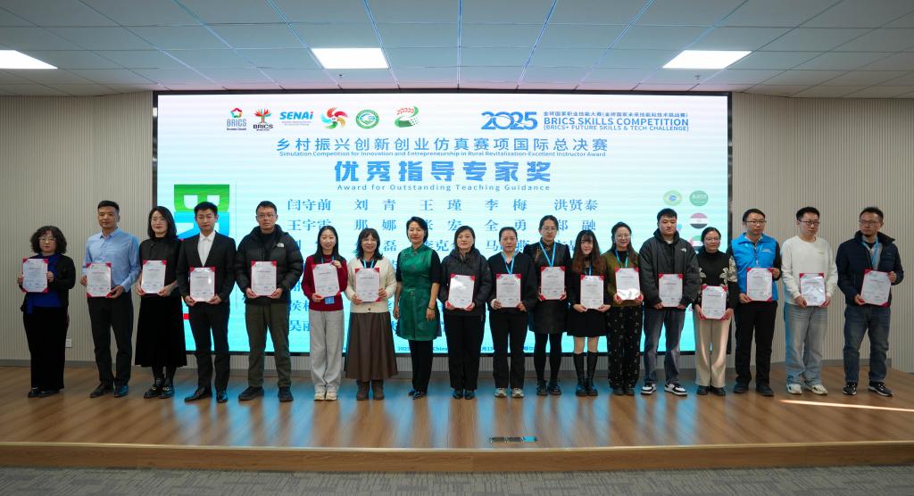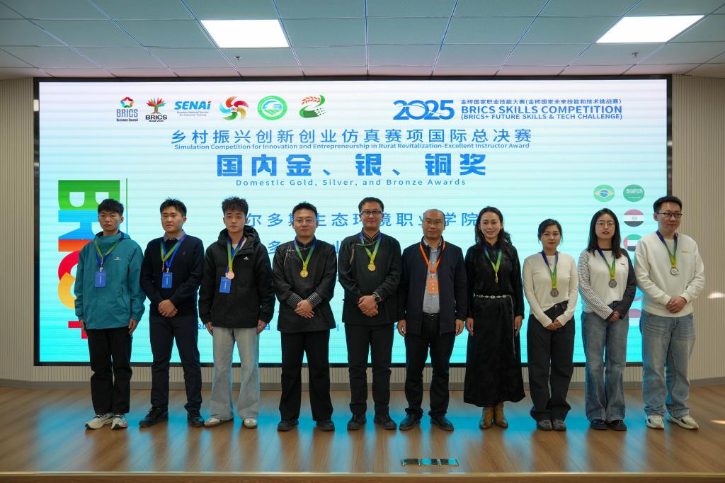 11月15日至17日,2025金砖国家职业技能大赛(乡村振兴创新创业仿真赛项)国际总决赛在鄂尔多斯生态环境职业学院举办。铁门关职业技术学院现代农业学院24级现代农业经济管理1班王浩、王存政、李天航三位同学组成的代表队表现卓越,凭借扎实的专业功底和出色的创新能力,荣获大赛铜奖。学院同时获得“优秀组织奖”,指导教师王宇雷、洪贤泰获“优秀指导专家”奖。