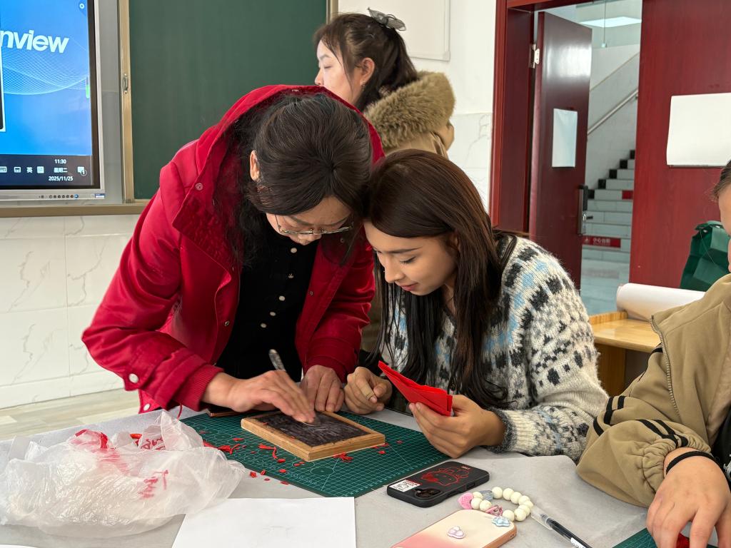 在实践环节,张老师穿梭于各个工位,进行一对一指导。针对学生在剪刻过程中出现的图案比例失衡、线条不够流畅等问题,她耐心示范、精准点拨,帮助学生快速找准技巧要领。同学们热情高涨,认真聆听、细心操作,在剪刀与红纸的碰撞中感受传统艺术的魅力,现场氛围浓厚热烈。