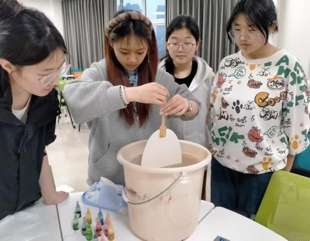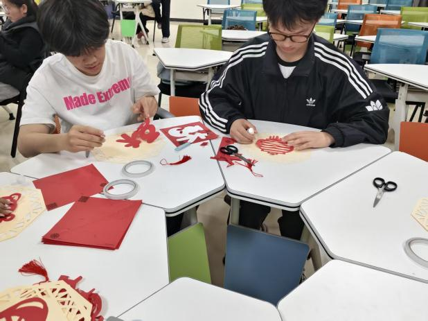 实践环节中,两地学生同步动手制作。漆扇体验部分,同学们在素扇上勾勒图案,完成各具特色的作品;剪纸环节,大家折纸、画样、剪裁,剪出吉祥纹样和创意图案。志愿者在线上进行指导与答疑。虽然相隔千里,两地学生通过云端互动交流,分享制作过程。
