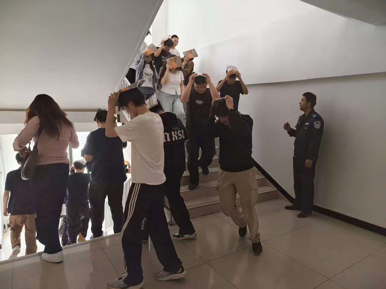 讲座结束后,模拟灾害警报响起。师生们迅速蜷缩身体、护住头部,就近躲避至安全区域。随后,大家按照预设疏散路线弯腰低姿、快速有序撤离。各楼层护导人员全程引导,确保通道畅通。整个疏散过程规范有序,不到3分钟,120名师生全部安全抵达指定集结区域,并完成人员清点与情况上报。