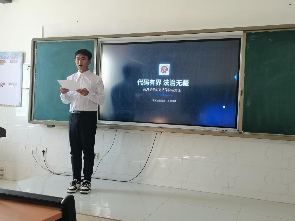 比赛中,选手结合专业背景与个人思考,在规定的3至5分钟内进行演讲。参赛学生主题突出、表达流畅,展现出良好的语言表达与法治素养,部分选手通过真情实感和现场互动,生动传递了对宪法精神的理解。