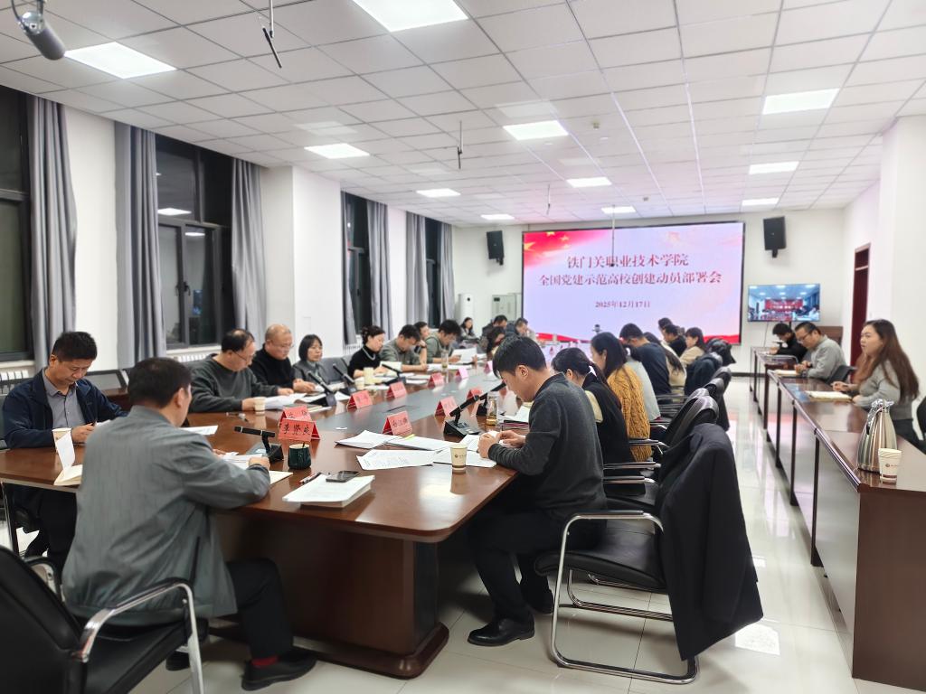 为深入贯彻落实党中央关于新时代党的建设总要求,系统部署培育创建工作,积极迎接“十五五”新征程的战略举措,12月17日,铁门关职业技术学院在铁门关校区燕赵楼126会议室与库尔勒校区技能训练中心一楼会议室以视频连线方式,同步召开党建工作领导小组专题会议,就全力创建“全国党建示范高校”进行动员与部署。学院党建工作领导小组全体成员参加会议,会议由学院党委书记李贤良主持。