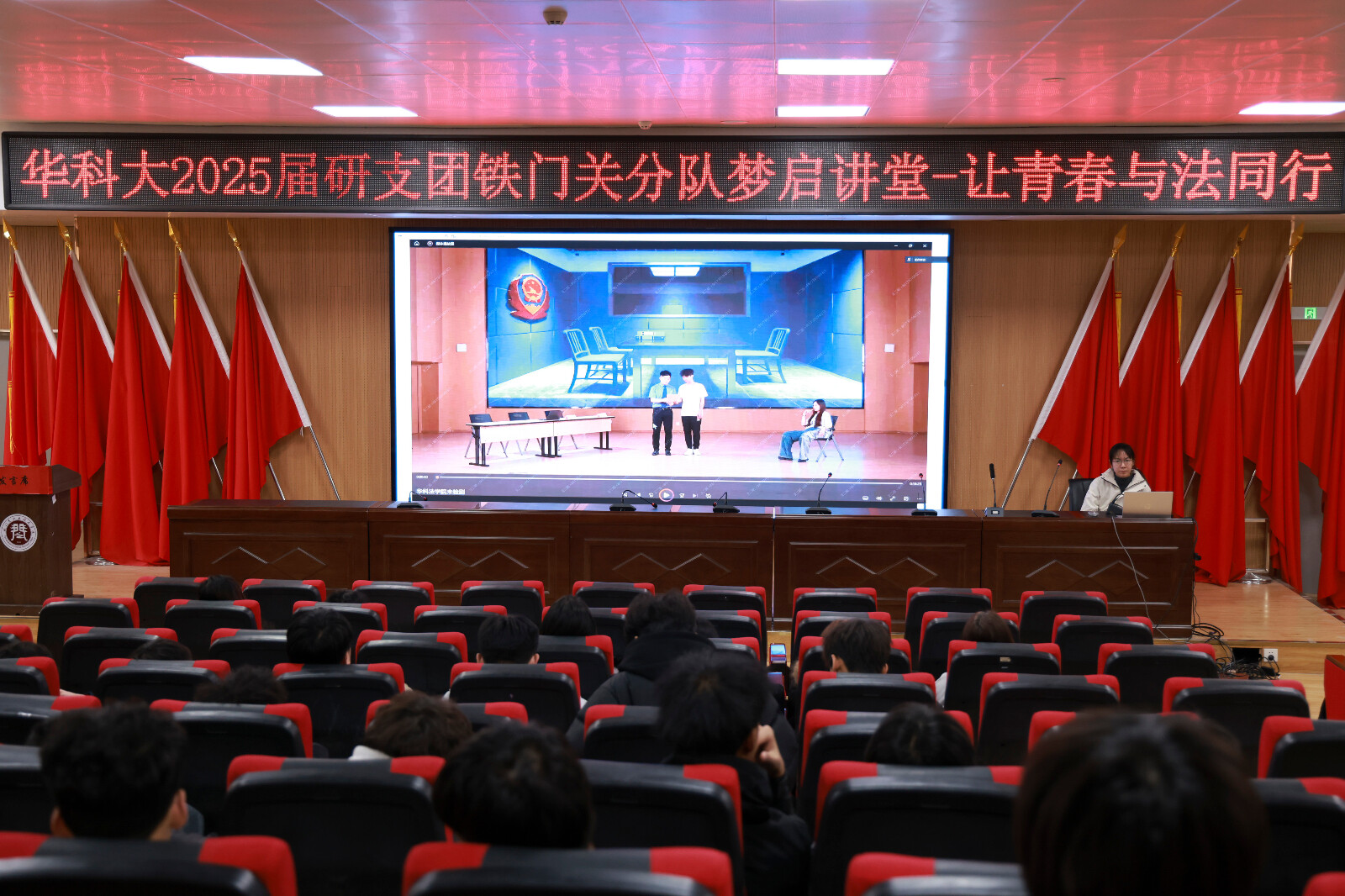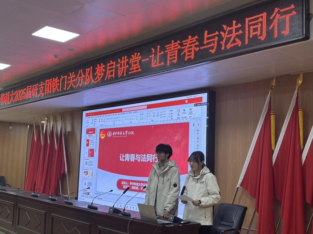 12月10日,由华中科技大学研究生支教团新疆铁门关分队策划组织的“梦启讲堂”系列讲座,在铁门关职业技术学院举办第二讲。本次讲堂由华科大26届研支团成员杜蓝瑜、周承桥、刘怡婷担任主讲人,他们以线上方式为学院全体学生做题为《让青春与法同行》的宣讲。