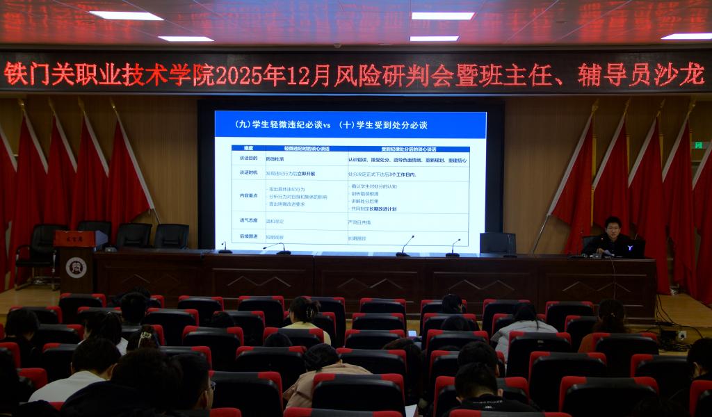 为进一步提升学生管理服务工作质量,强化班主任、辅导员队伍建设,12月24日,铁门关职业技术学院在燕赵楼121阶梯教室召开12月学生管理风险研判会暨班主任、辅导员沙龙活动。各二级学院分管学生工作的负责人、全体学工秘书、班主任及辅导员参会。