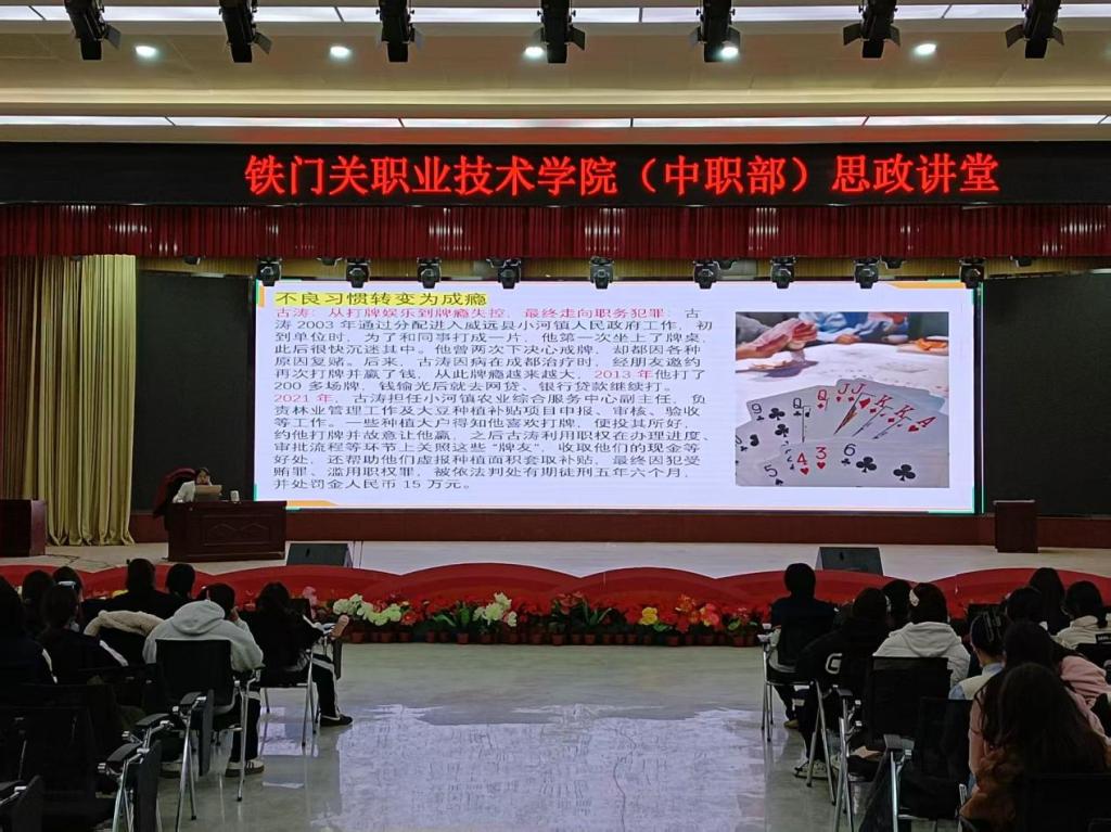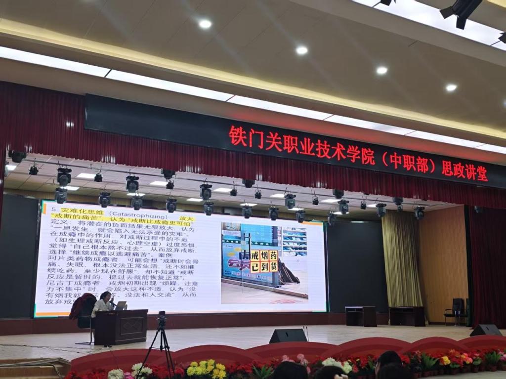 为普及心理健康知识,提升学生心理调适能力,筑牢校园心理健康防线,11月20日下午,铁门关职业技术学院中职部赵亚丽老师面向全校1200余名师生,开展“致命诱惑・拒绝成瘾”心理健康专题讲座。